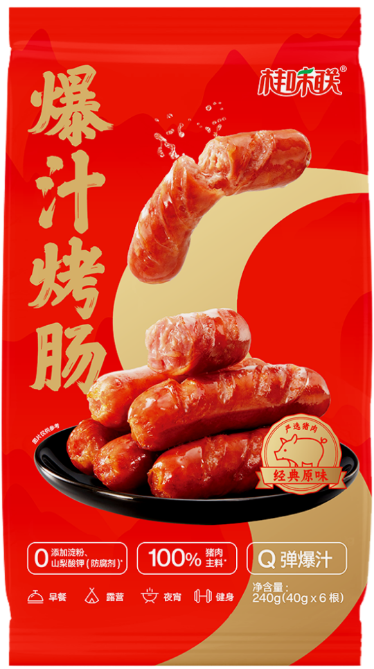 根根緊實有嚼勁、飽滿肉感看得見,皮脆肉彈、一口爆汁。低溫物理場鎖水工藝保留肉汁水口感,鹽溶蛋白重構肌肉蛋白網絡賦予烤腸脆彈爽口的口感。